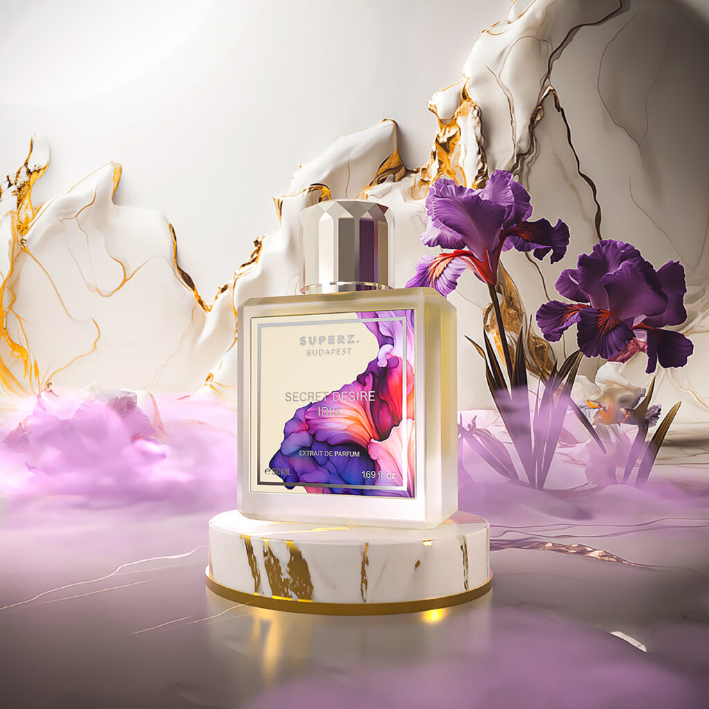 What makes Secret Desire Iris truly attractive is the iris (Iris), known in Hungarian as nőszirom. In the world of perfumery, the plant’s stem and root are most often utilized, which has an earthy, woody, powdery scent, slightly reminiscent of cooked carrots. However, in this composition, we experience the scent of its flower, which is simultaneously purple, soft, powdery, and easily recognizable.